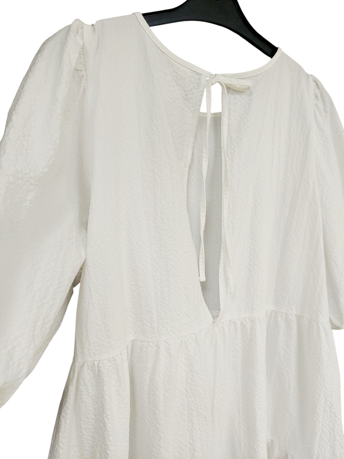 Kaikon valkoinen mekko. Selässä syvä halkio, solmitaan naruilla.