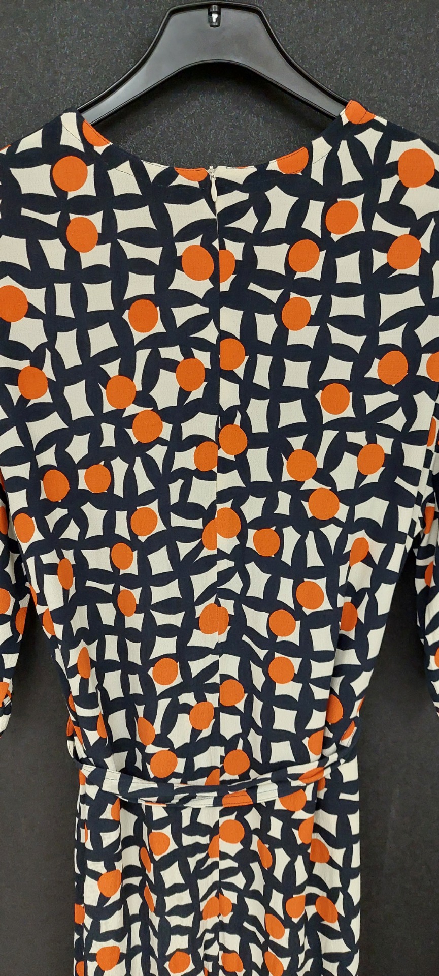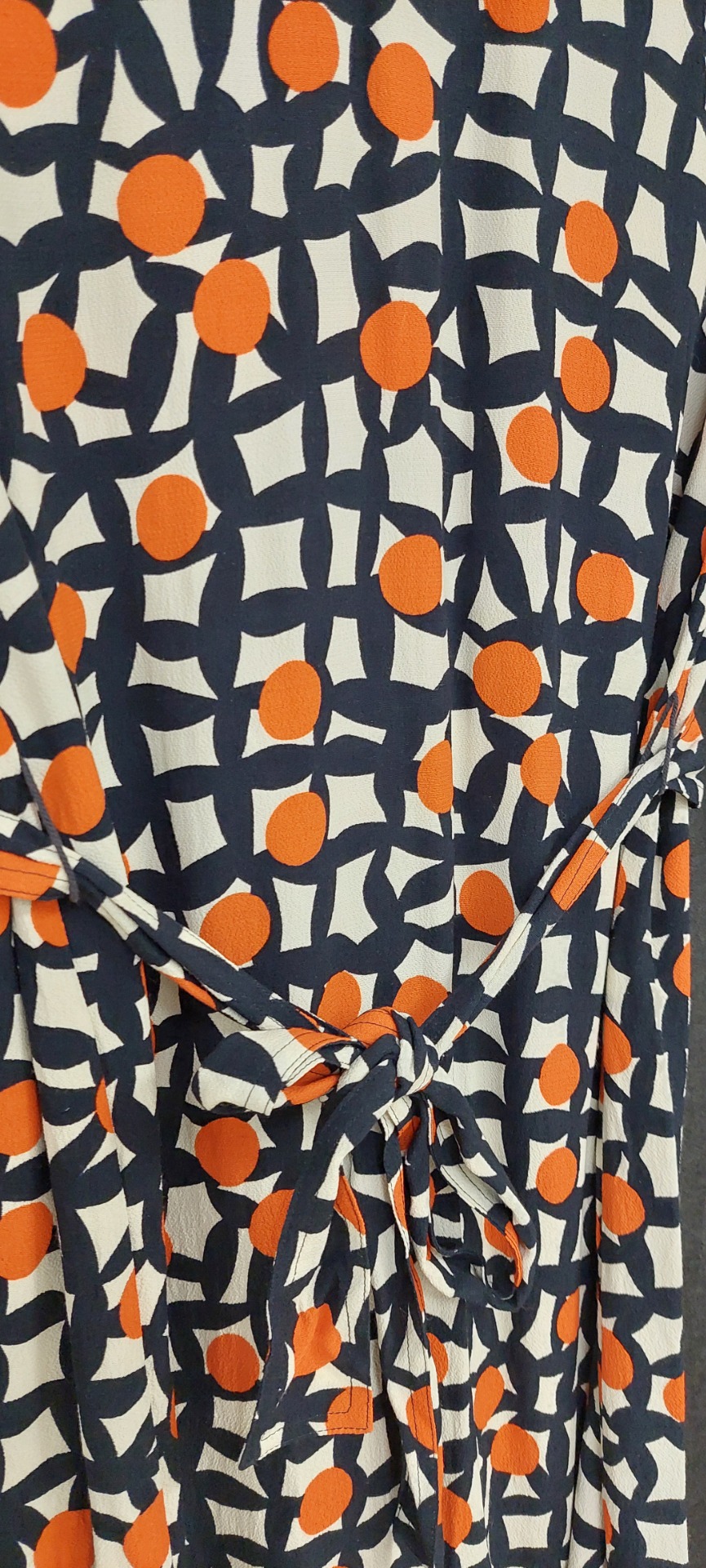 Marimekon Todellinen Pielikki mekko. Viskoosikrepistä valmistettu väljästi istuva mekko. Hartioilta pudotetut 3/4-hihat, pyöreä pääntie, piilovetoketju selässä, polven alapuolelle yltävä helma. Irrotettava vyö.