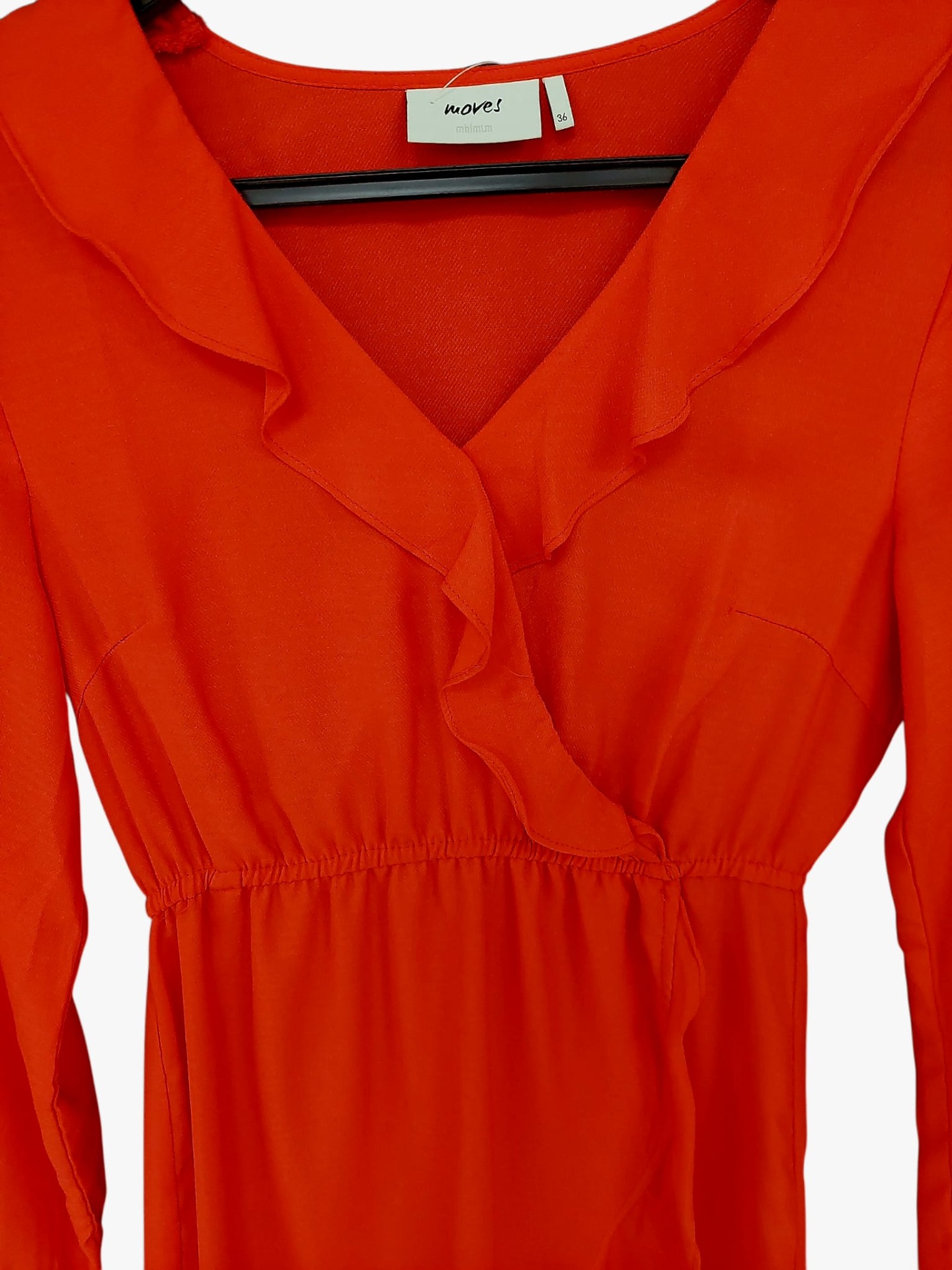 Kivasti laskeutuva kirkkaan punainen mekko merkiltä moves. Koko 36. Helma auki kietaisutyylisesti vyötäröresorista alaspäin. Kivoja röyhelö yksityiskohtia.