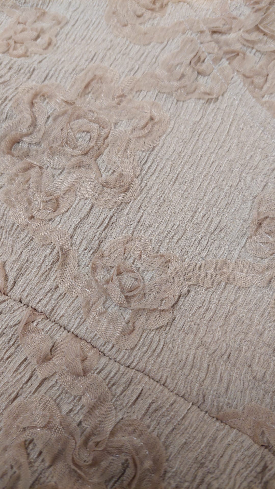 Kaunis beige pussihihainen paita. Kiristysresorit hihansuissa ja olkapäätä hieman "pussittaa". Vyötäröllä leikkaus ja helma levenee alaspäin saumasta.