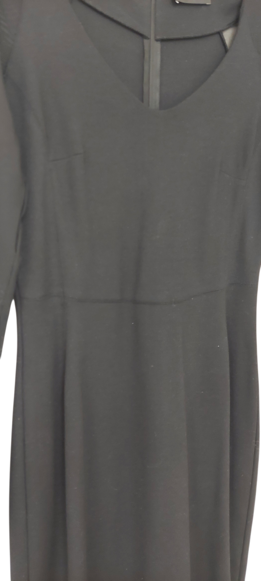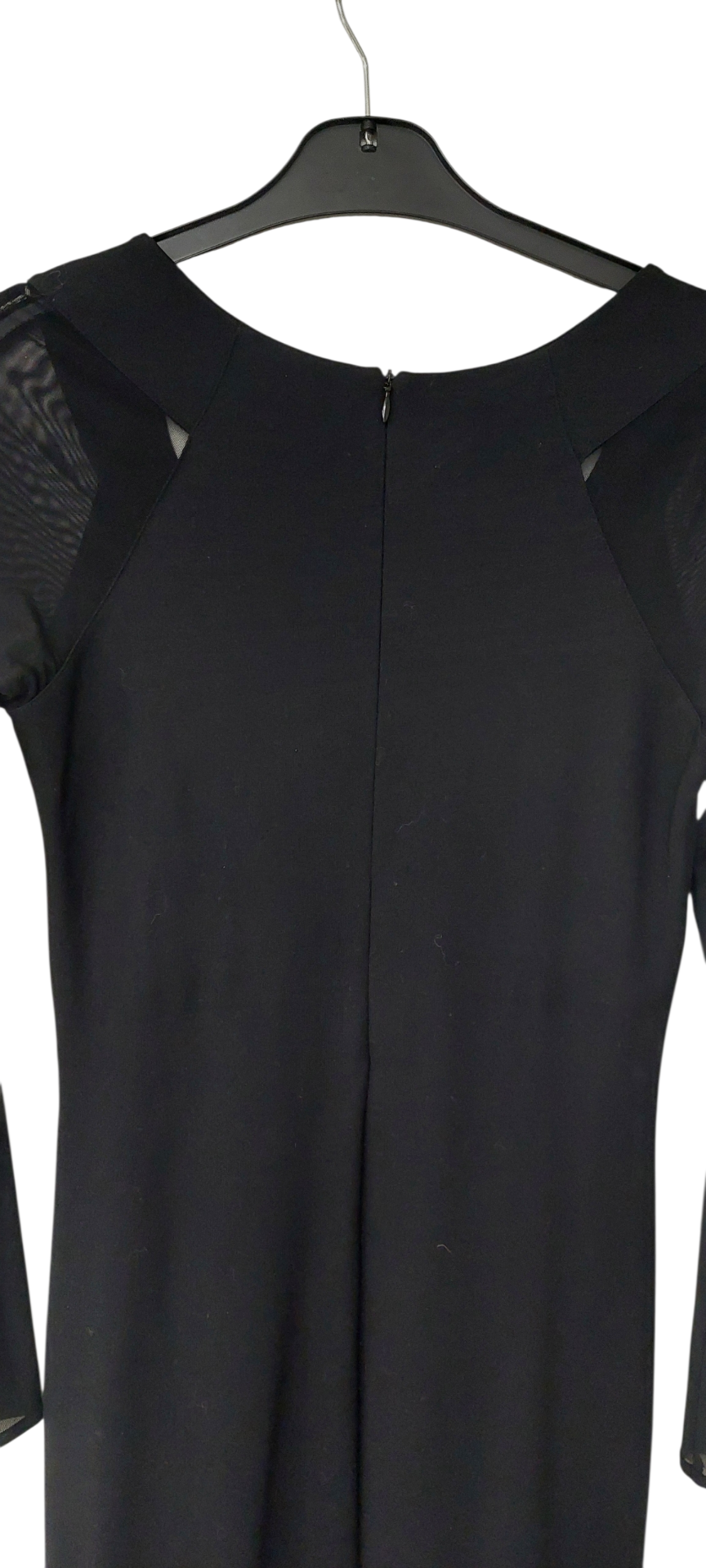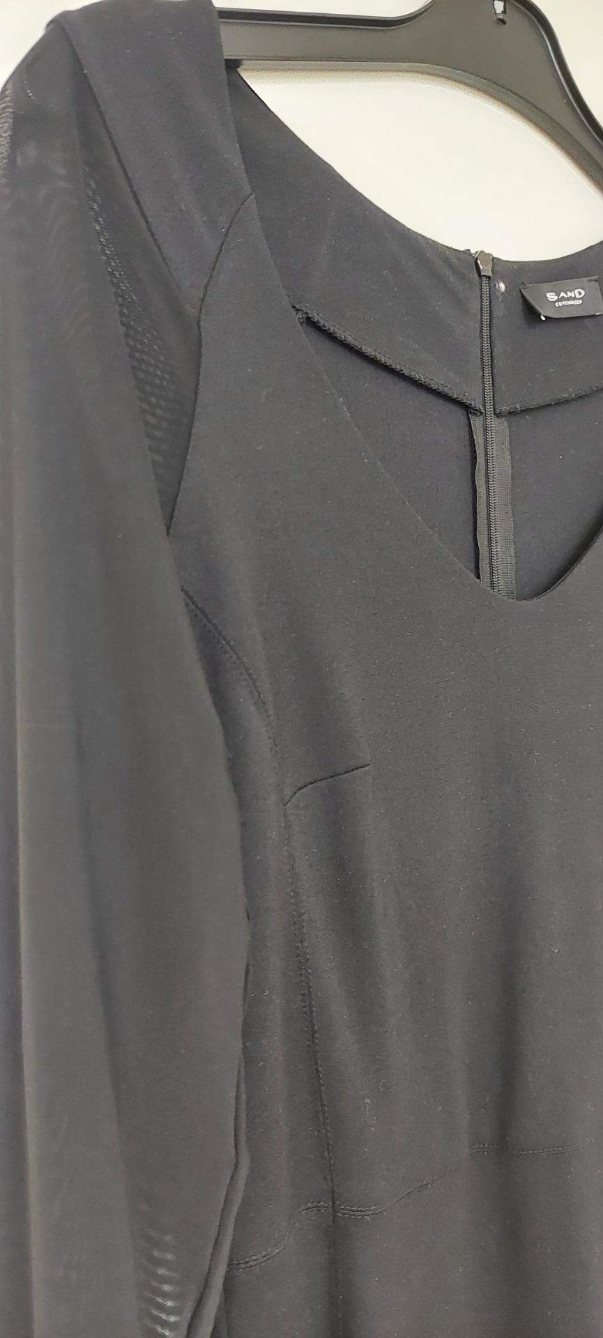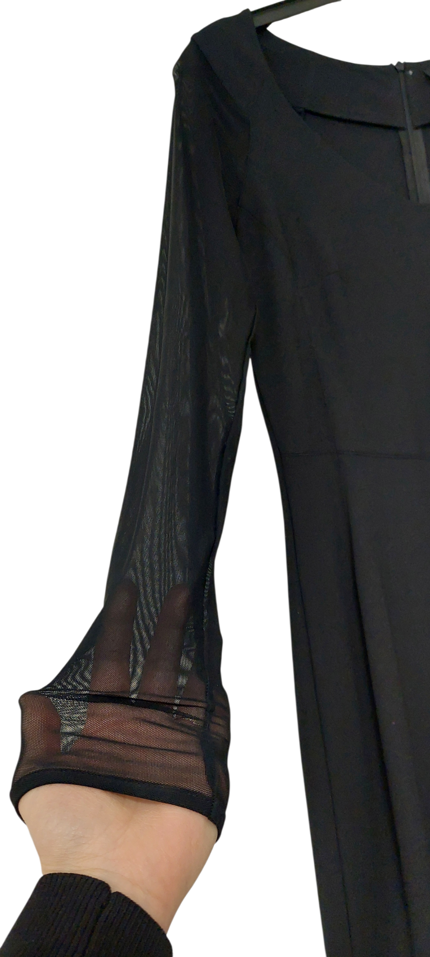 Sand merkiltä musta kotelomekko mallinen mekko, ohuet läpikuultavat hihat. Polvenmittainen mekko. Takana piilovetoketju. Kivoja yksityiskohtia saumoissa. Vyötäröleikkaus.
